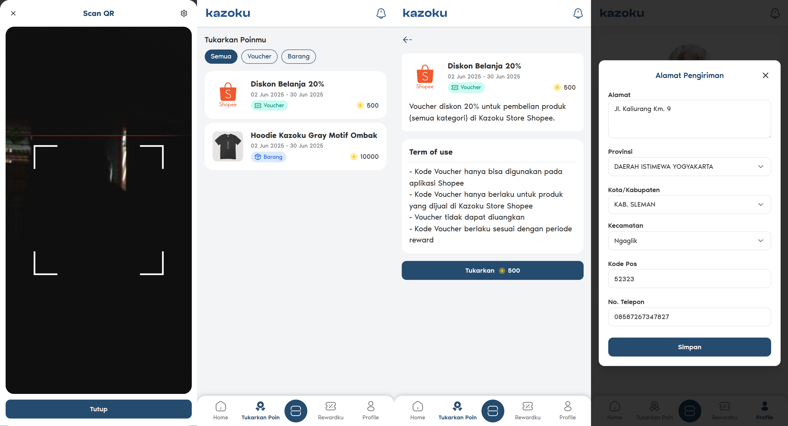 Aplikasi ini memungkinkan pelanggan mengumpulkan poin dari setiap pembelian produk melalui pemindaian QR code, yang kemudian dapat ditukarkan dengan reward seperti voucher diskon atau barang. Sistem ini bertujuan untuk mendorong pembelian berulang dan membangun loyalitas jangka panjang, dengan cara membuat pelanggan yang sudah pernah berbelanja terdorong untuk kembali lagi.