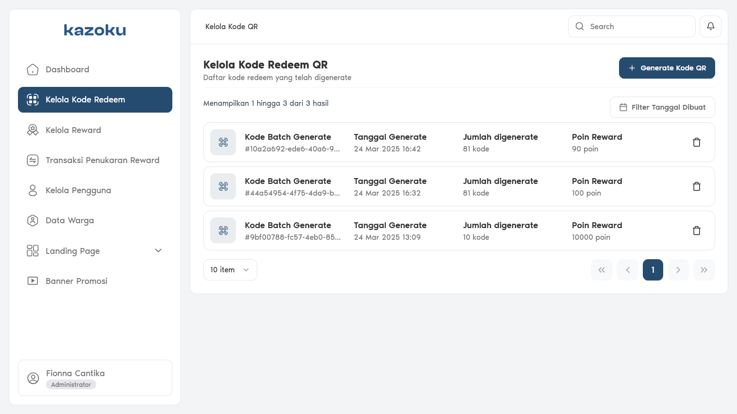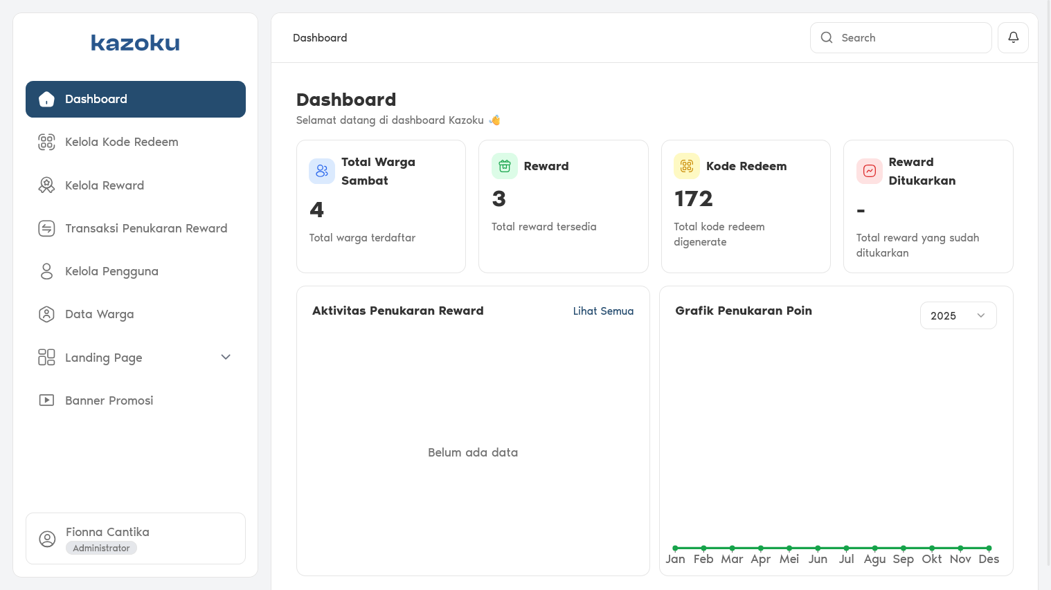 Di sisi admin, aplikasi dilengkapi dengan dashboard lengkap untuk mengelola QR code, generate QR code, mengelola reward dengan tipe voucher dan barang, mengelola transaksi penukaran reward, mengelola pengguna terdaftar, dan mengelola halaman landing page. Admin dapat menyesuaikan tampilan landing page seperti slideshow produk, Frequently Asked Question, hingga testimoni pelanggan secara langsung dari dashboard tanpa perlu menyentuh kode.