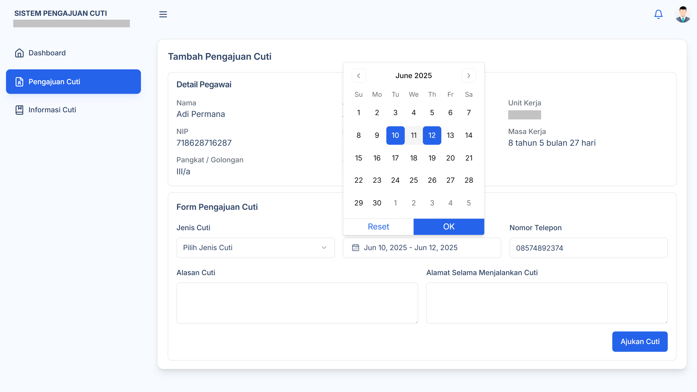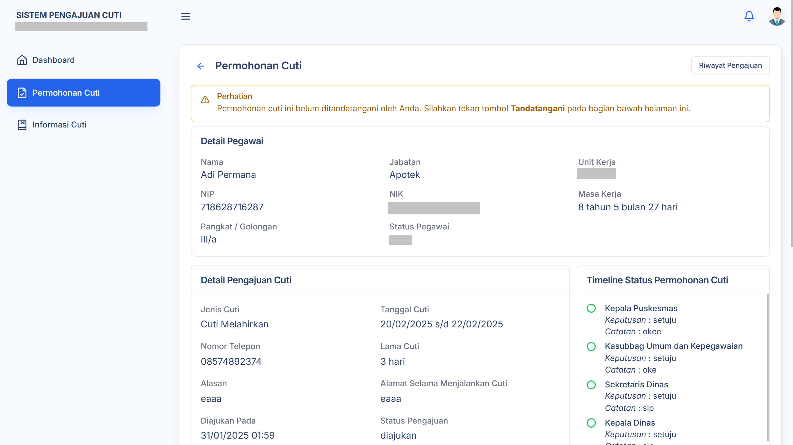 Dengan sistem ini, proses pengajuan cuti menjadi lebih cepat, efisien, dan ramah lingkungan karena meminimalkan penggunaan kertas dalam seluruh alur kerja.